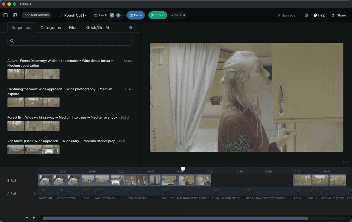 When you're happy with the Igbo interview-based story, Eddie will place B-roll on top of that story spine (if you imported B-roll). Eddie logs the B-roll and creates apt sequences that it places over the A-roll story.