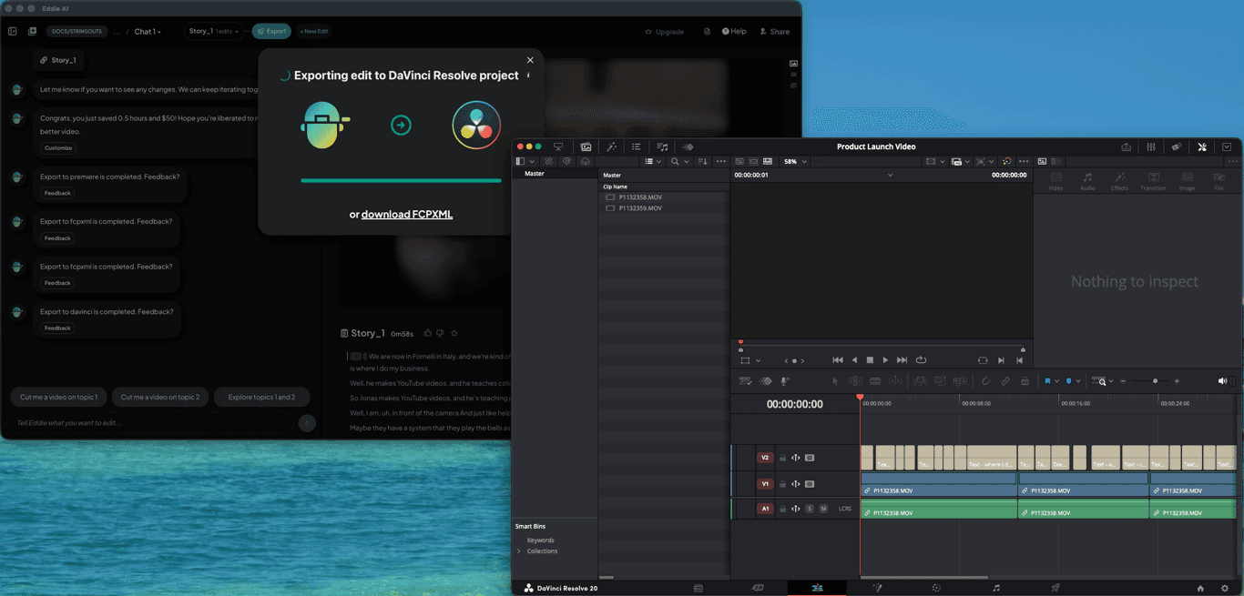 Once you're happy with the rough cut, export it to DaVinci Resolve (or non-linear editors, such as Adobe Premiere Pro, and Final Cut Pro). Eddie creates a sequence where clips relink to the source media so you can adjust, polish, add music, color, and title. You can also receive the metadata of the logged footage that makes it easy to search for additional soundbites and B-roll.